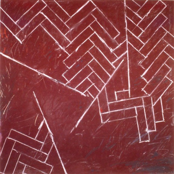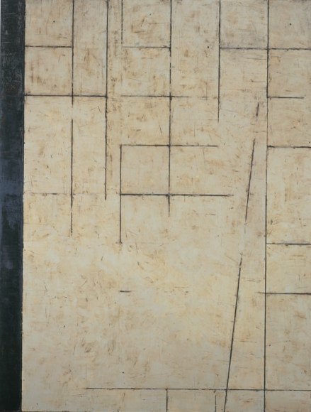 Gummelt builds many of his larger works by assembling either canvas panels or wooden panels resulting in modular constructions. He often manipulates the wooden surfaces by cutting shallow horizontal and vertical grooves in the panels. This technique was used extensively in the works from 2001-2004; note Galveston, 2001.