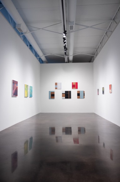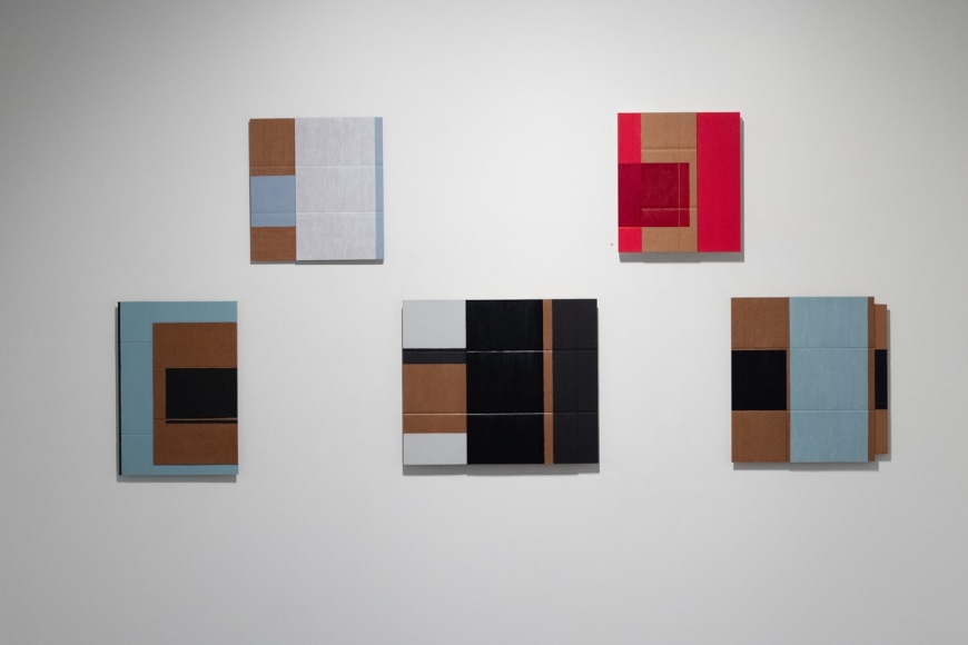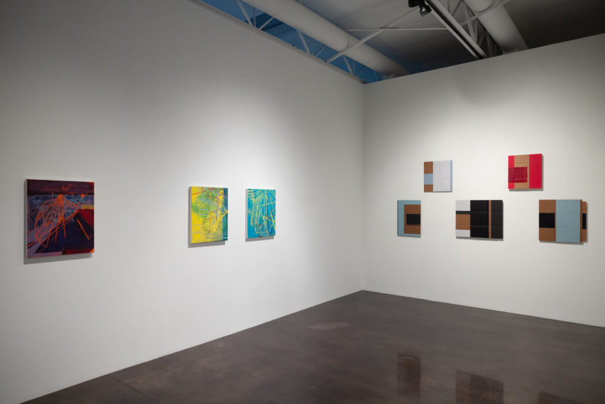 the cardboard compels me to make different decisions about structure and applying paint. The raw/exposed cardboard is an important visual element in a finished work. I use oil paint, shellac, and pencils. I begin each work by cutting a piece of cardboard to a rectangular shape. I add a second layer of cardboard. Now I have something I want to paint on. I respond to this construction using self-imposed rules for creating an artwork (abstract, geometrical, rectilinear, asymmetry , 2-4 colors, pencils lines). My rules are restrictive, but I reserve the option to change them. My goal for each painting is to create a cogent image that adheres to my intuitive sense of “rightness”.