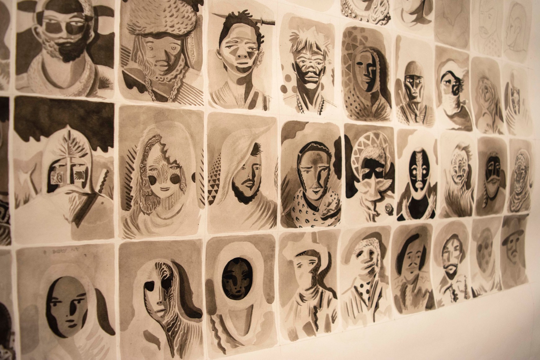 Lawrence Lee discusses his narrative that unfolds in his 60” square drawing, “I am writing a story that takes place in another world and the drawing depicts some of the warriors that live there. In the story there is a mountain island in the middle of the ocean where a certain bird lives. Once every 700 years, the bird begins to sing and the song can be heard all over the world. Warriors from all corners of the world can hear the singing and the bravest among them respond. They sail to the mountain and attempt to ascend its side. The mountainside is filled with peril, dangerous beasts, and poisonous plants. The first seven warriors to reach the top and pluck one of the bird’s tail feathers become immortal warriors/protectors of the world. They serve to protect inhabitants of the world until the bird sings again after many years. The drawing depicts these brave heroes as they first behold the isle on the horizon.”